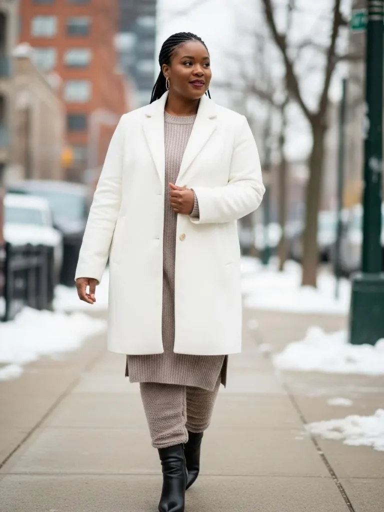 I love how this outfit feels put together without trying too hard. The mix of soft textures with bold boots creates a balance that flatters curves beautifully. I also adore how the long coat adds length while the white sweater brightens the whole look. It is the kind of winter outfit that makes me feel warm, confident and ready to glide through a cold day looking effortlessly elegant.