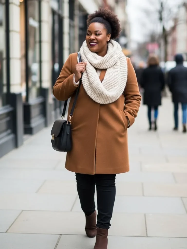 I love this look because it proves that winter outfits can feel chic without trying too hard. The camel coat instantly brightens cold days and looks flattering on every body shape, while the oversized scarf adds texture that feels both stylish and comforting. The dark pants streamline the silhouette in the best way, and those little ankle boots give the whole outfit a confident finish. Honestly, this is the kind of look I’d reach for when I want to stay warm but still feel like the main character on a winter sidewalk.
