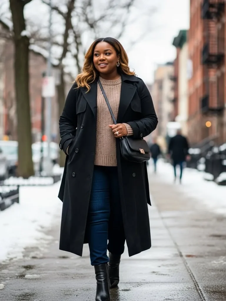 This outfit brings together a long black trench coat with a soft structure that adds instant polish to a simple winter look. Underneath, the cozy beige knit sweater feels warm and relaxed while still looking put together. The dark blue fitted jeans keep the silhouette sleek and the black heeled ankle boots add a little height without sacrificing comfort. The black crossbody bag ties everything together and gives the look an easy city ready vibe.