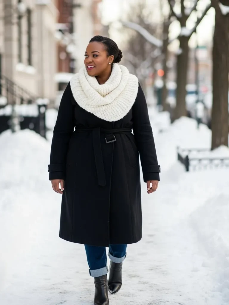 This look brings together a long black wool coat that feels beautifully polished, paired with rolled dark denim that keeps things relaxed and practical for snowy sidewalks. The star of the outfit is that chunky cream knit infinity scarf that sits like the softest cloud around the shoulders. Black ankle boots add a sleek finish and make the whole look feel effortlessly put together. The overall vibe is cozy, confident, and ready for a winter day that still calls for a little style moment.