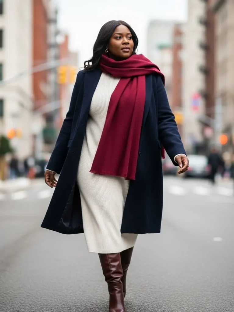 This look is all about quiet luxury with a comfy twist. The outfit pairs a soft winter white ribbed knit dress that hugs the body in a relaxed, flattering way with a long navy coat that adds instant polish. The deep burgundy scarf brings a gorgeous pop of color and ties the whole palette together in the most elegant way. Tall brown leather boots finish the look with that perfect mix of warmth and sophistication, making the outfit feel city chic and totally effortless.