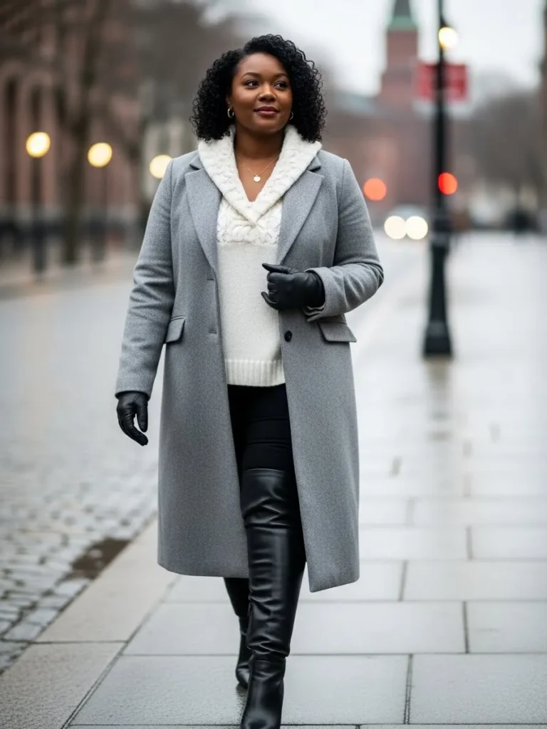 This outfit brings together the perfect winter trio. A soft gray wool coat creates a smooth, tailored silhouette while a plush white sweater with a fluffy collar adds that warm and snuggly feel we all crave on chilly mornings. Black leggings keep things sleek and comfortable, and the over the knee black boots bring the whole look into confident winter chic. The black leather gloves tie everything together with a polished finish that feels practical and stylish at the same time.