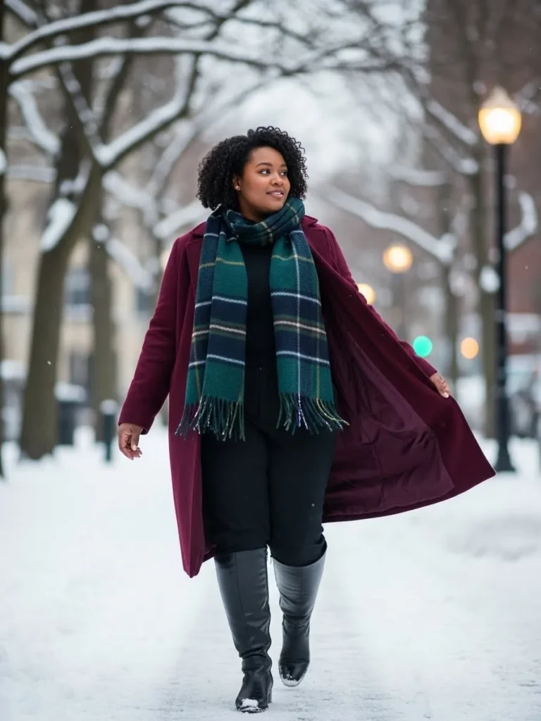 This look is all about simple pieces that feel elevated without trying too hard. The long burgundy coat instantly brings warmth and richness to the outfit and the way it moves adds this little moment of drama that I love. Underneath she keeps it classic with an all black base that feels sleek and timeless. The tall black boots pull everything together and create a clean line from hip to toe. The deep green and navy plaid scarf gives the whole outfit a soft winter vibe and adds just the right pop of pattern without overwhelming anything.