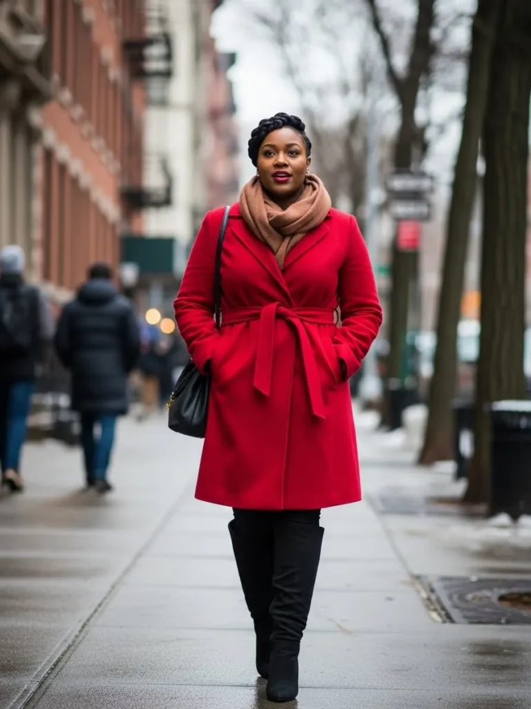 This look is all about a rich red wool wrap coat that instantly brightens a winter day. The coat has a clean tailored fit with a soft tie belt that pulls the waist in just right. A warm camel scarf adds a cozy contrast and blends beautifully with the seasonal color palette. Black leggings keep the base simple while sleek black knee high boots polish everything off. The outfit feels city chic yet totally wearable with its mix of soft textures and confident color.