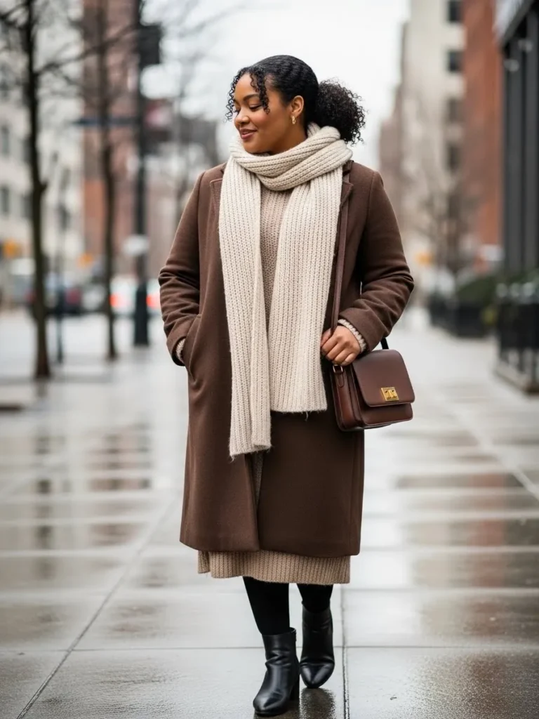 This look brings together everything I love about polished winter dressing. The outfit features a rich brown wool coat that feels warm and timeless, paired with a soft ribbed knit dress in a lighter beige tone that adds a gentle contrast. A chunky cream scarf wraps beautifully around the neck for that cozy city chic vibe I can never resist. Black tights and sleek black ankle boots keep the look streamlined, while a structured brown shoulder bag ties the whole palette together. The overall feel is elegant, calm, and perfect for cold mornings when you still want to look put together.
