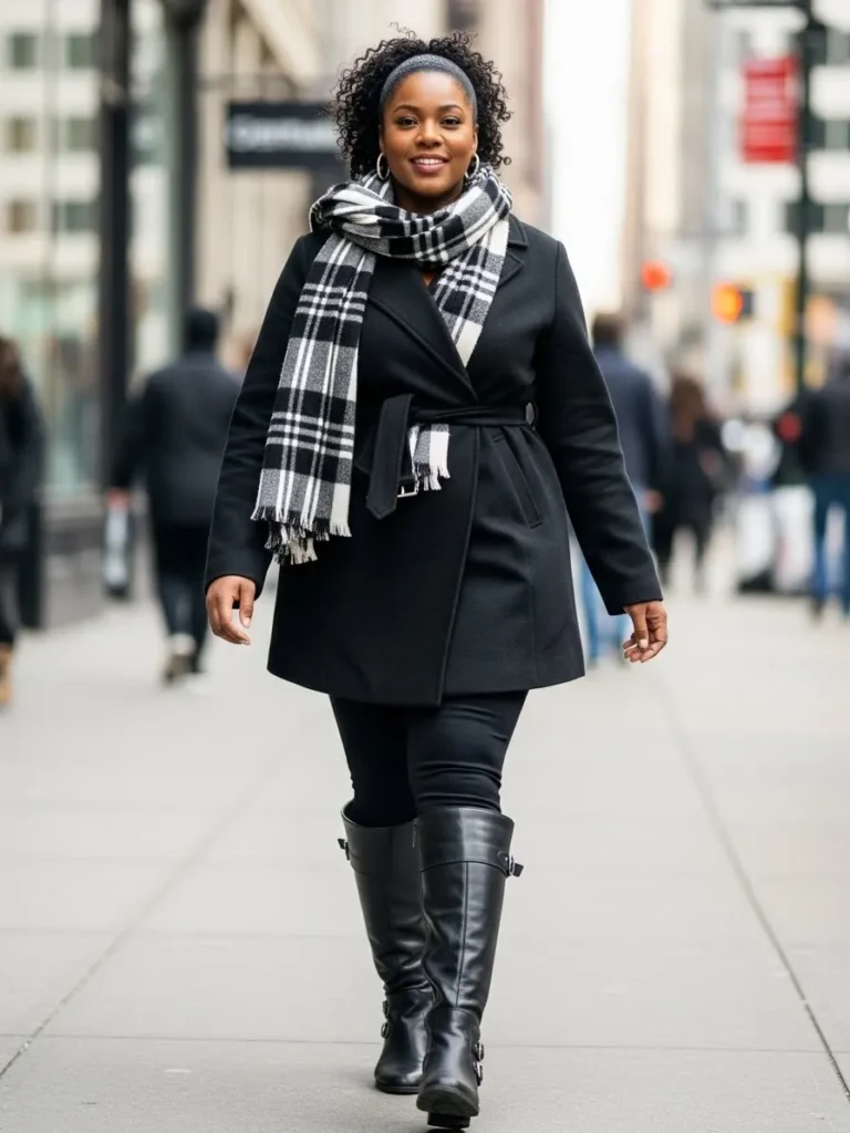 This look brings together all the winter essentials in the chicest way possible. She is wearing a sleek black wrap coat that cinches at the waist for that lovely hourglass shape. The coat pairs perfectly with fitted black leggings that keep everything streamlined. The black knee high boots add structure and polish with their smooth leather finish. The black and white plaid scarf adds just the right amount of pattern and softness. Her curly hair pulled back with a simple headband keeps the whole outfit clean and put together. The vibe feels modern city chic with a cozy twist.