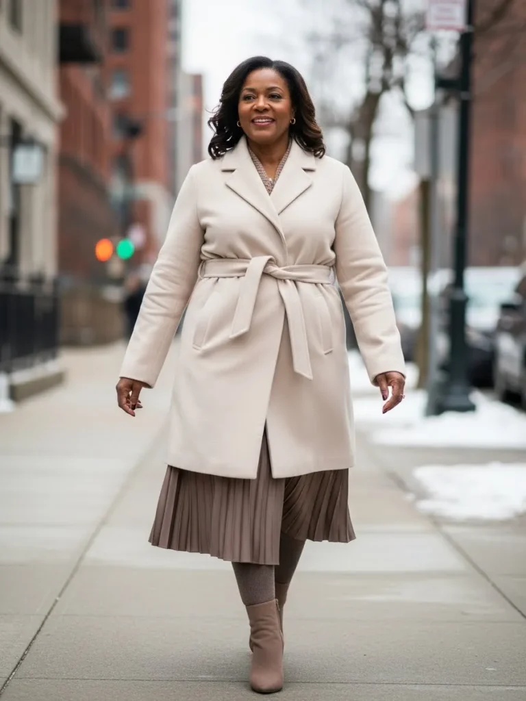 I love how this outfit works because the neutral layers feel effortless while still looking put together. The coat creates a clean shape that flatters the waist and gives the whole look a gentle structure. The pleated skirt adds that little swish that makes you feel extra confident when you walk. The monochromatic tones feel so chic to me and they make the outfit look expensive without trying too hard.