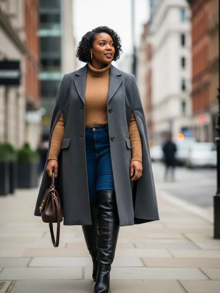 I love how this outfit feels effortless but still very put together. The cape coat adds drama in the best way and the camel turtleneck warms up the color palette without feeling heavy. I find that the combo of fitted jeans and knee-high boots always creates a flattering line for my legs. It feels chic, timeless, and honestly perfect for those days when I want to look stylish with zero fuss.