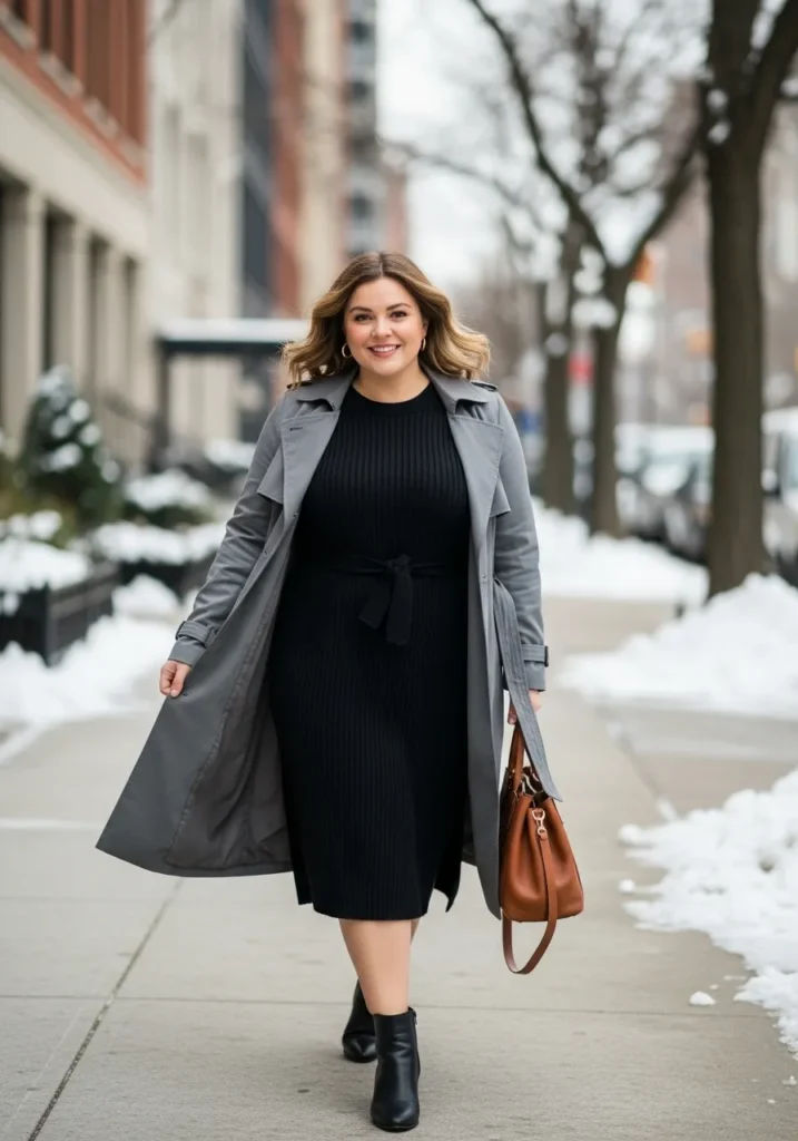 This outfit pairs a beautifully fitted black ribbed sweater dress with a classic gray trench coat that moves so effortlessly it almost feels like its own accessory. The dress has a soft knit texture and a tie at the waist that adds shape without trying too hard. The gray trench keeps everything polished while black ankle boots ground the look with a clean and modern finish. The warm brown leather bag brings in a hint of contrast that feels luxe but still everyday practical. The whole vibe reads confident city winter with just the right touch of laid back elegance.