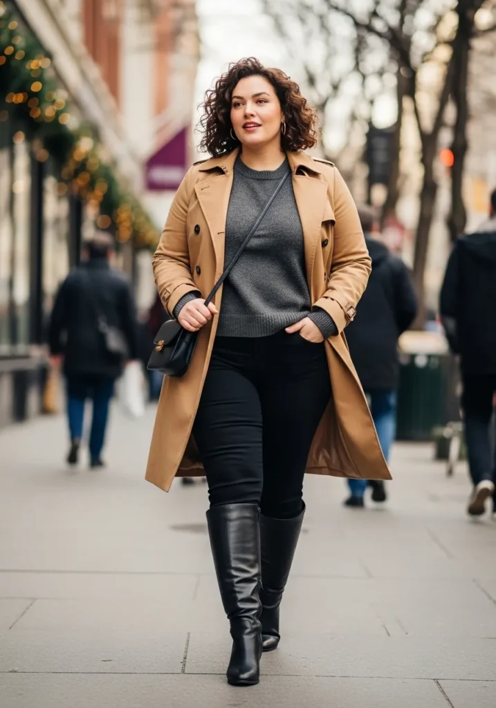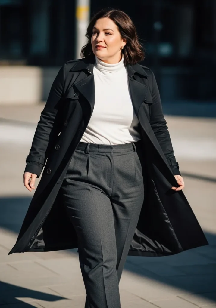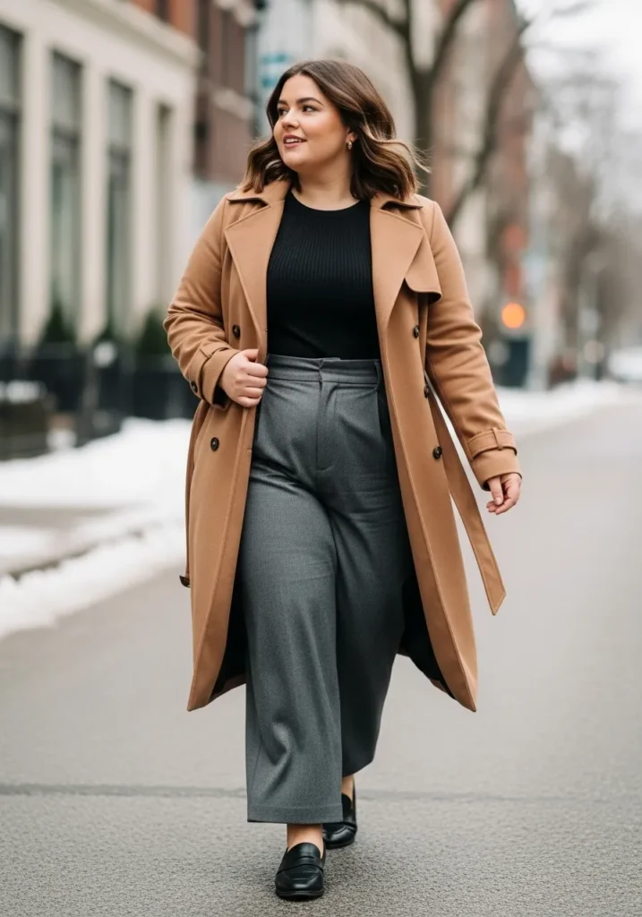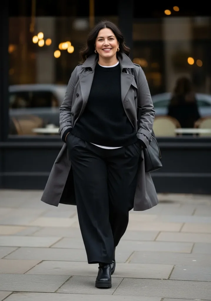I love this outfit because it has that sweet spot of classic and modern that always looks amazing on curvier bodies. The long trench creates a smooth line that instantly elongates my frame while the wide leg trousers balance everything in the best way. The black on black layers feel chic without being fussy and the gray trench adds just enough contrast to keep the outfit interesting. It is the kind of winter look that makes me feel warm confident and stylish all at the same time.