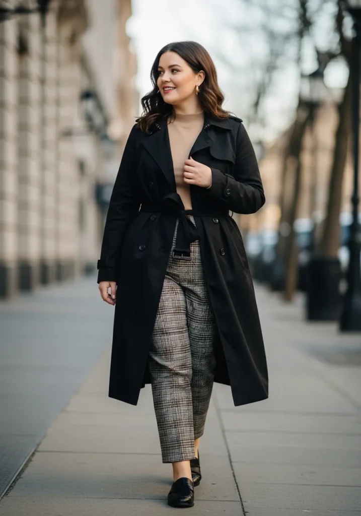 I love how this look feels timeless without trying too hard. The trench instantly sharpens the whole outfit and gives me that quiet confidence boost I always appreciate on chilly mornings. The beige top warms up the palette and softens the black coat beautifully. The plaid trousers are the little personality moment I crave when I want something interesting but still classy. It all comes together in a way that feels chic flattering and totally wearable for real winter days.