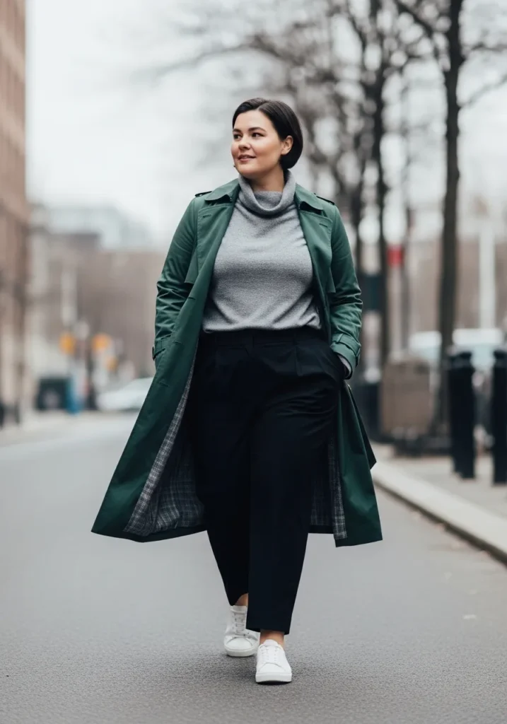 This look brings together a deep green trench coat with a soft plaid lining, a cozy light gray cowl neck sweater, and classic black tailored trousers. The mix of fabrics feels warm and structured at the same time and the white sneakers keep everything relaxed and easy for a winter stroll. The whole vibe feels polished but still completely wearable and the muted colors blend beautifully with the winter city backdrop.