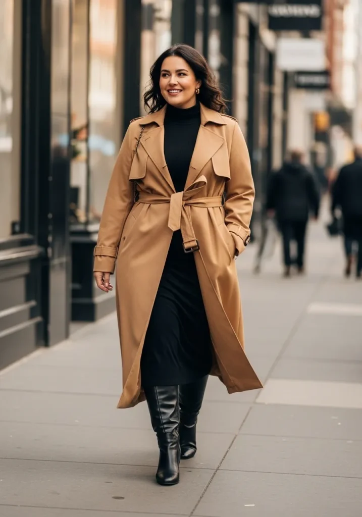 This look pairs a beautifully structured camel trench with a soft tie belt over a simple black turtleneck and a long black dress that moves effortlessly as she walks. The coat has that classic smooth fabric that always feels polished, and the rich tan color warms up the entire outfit. Knee high black leather boots finish the look with a confident stride while the gold hoop earrings add a tiny glimmer that feels just right. The whole vibe is clean, city chic, and quietly powerful in the best way.