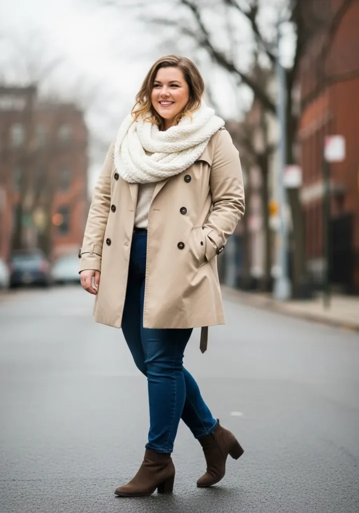 This look is all about soft winter neutrals layered in the coziest way. The classic beige trench coat keeps everything polished while the thick, creamy knit scarf brings in that snuggly, wrapped-up feel we all crave on chilly mornings. Underneath, she wears a simple light sweater tucked into dark blue skinny jeans that balance the outfit perfectly. The brown ankle boots give just the right amount of structure and finish things off with a clean city chic vibe.