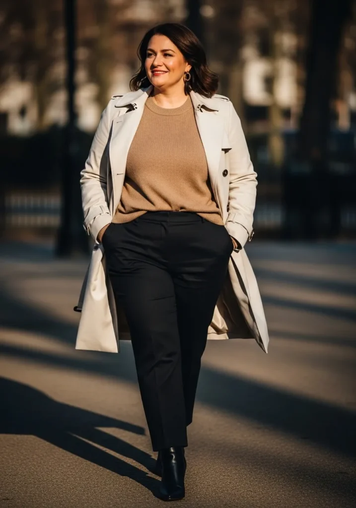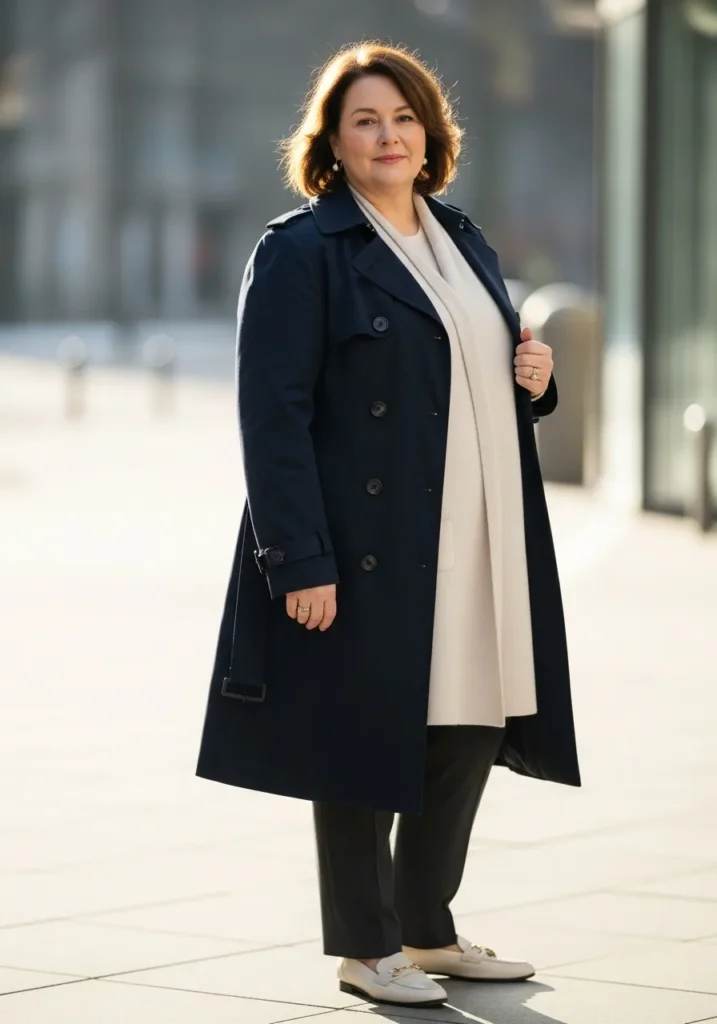 I love how this outfit balances comfort and sophistication without trying too hard. The navy and camel combo always feels timeless and the long trench naturally elongates the figure in the best way. The fitted pants and ankle boots give a gentle lift that makes the whole silhouette feel clean and confident. It is one of those outfits that makes me feel pulled together even on days when I am absolutely not trying to impress anyone.