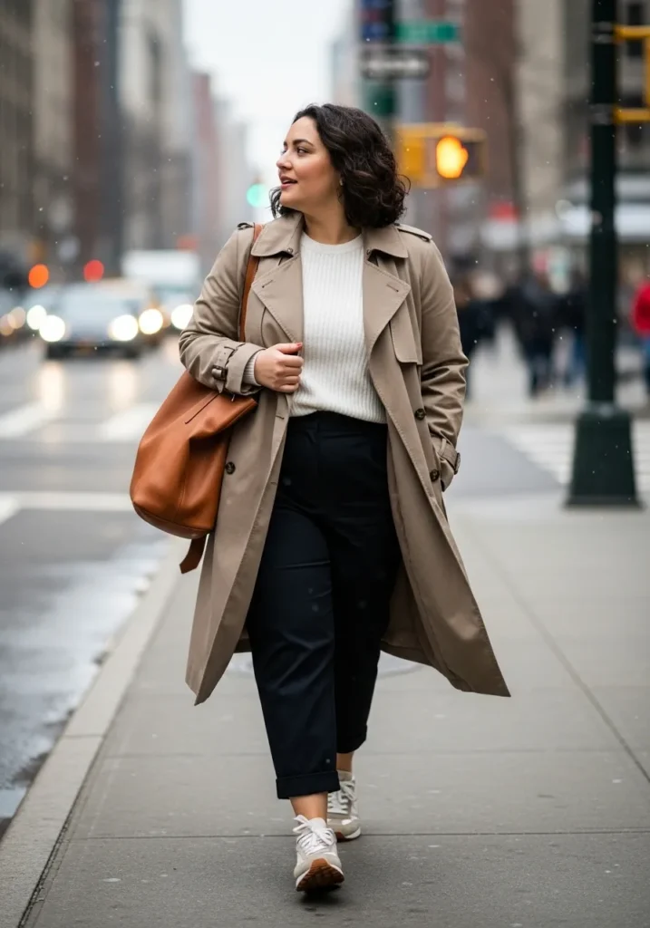 This look pairs a timeless beige trench coat with a soft white knit sweater and cropped black trousers that keep everything clean and polished. The trench has that perfect structure that moves beautifully as she walks, while the creamy sweater adds warmth without feeling bulky. The trousers add a neat contrast and the rolled hem gives the outfit a relaxed touch. Sneakers keep the whole look practical for a busy winter day and the oversized cognac bag adds a rich pop of color that ties it all together.