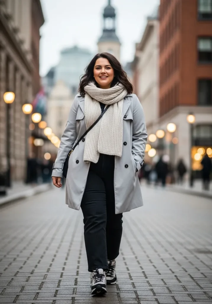 This look pairs a light grey trench coat with a chunky cream knit scarf that instantly makes everything feel warm and inviting. The coat has that classic double breasted shape that always looks polished, while the soft scarf brings in cozy texture. Underneath, she keeps things simple with a black base outfit that anchors the lighter tones. Black straight leg pants and sporty winter sneakers make the outfit practical for cold weather walks. The crossbody bag keeps the whole look hands free and effortless, perfect for a day out in the city.