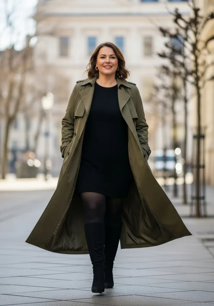 This outfit pairs a timeless olive green trench with a simple black knit dress that feels warm yet polished. The longline silhouette of the coat adds instant drama in the best way and the structured collar keeps everything looking refined. Black tights and sleek knee high suede boots tie the whole look together with a smooth, clean finish. The overall vibe is elegant and confident with just the right hint of winter minimalism.