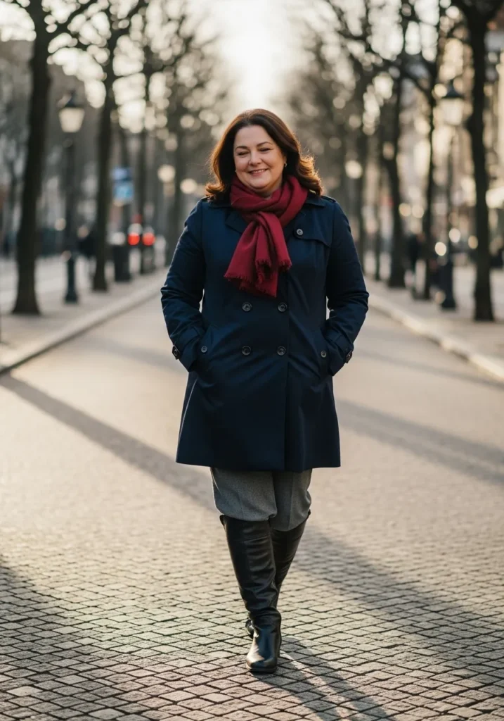 I love how this outfit feels so effortlessly flattering. The navy trench creates a long clean line that makes me feel put together even on days when I am running out the door. The burgundy scarf adds personality without being loud. The tall boots always make me feel a bit taller and more confident. It is one of those looks that works for errands brunch or a winter stroll and I adore how dependable and stylish it feels every single time.
