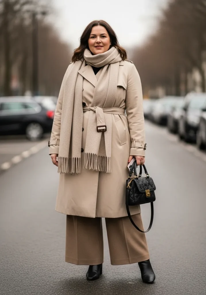 This outfit brings together all the cozy neutral magic I adore in winter dressing. The classic beige trench coat feels refined and structured, especially with the matching belt tied neatly at the waist. The long, soft scarf adds warmth and texture without overpowering the look. Wide leg trousers in a deeper taupe tone keep everything feeling calm and coordinated, while sleek black ankle boots and a small quilted black handbag add a bit of contrast that makes the whole outfit pop. The entire vibe is calm, elegant, and beautifully timeless.