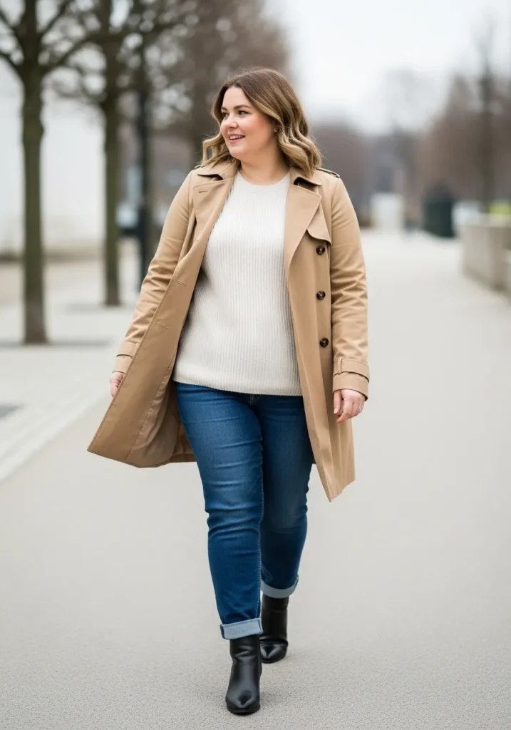 I love this outfit because it hits that sweet spot between comfy and chic. The camel trench makes everything look intentional with zero effort and the neutral sweater softens the whole look in the prettiest way. The jeans keep it real for everyday life and the ankle boots give me that little boost of confidence. It is one of those outfits that makes me feel ready for anything while still feeling like myself.