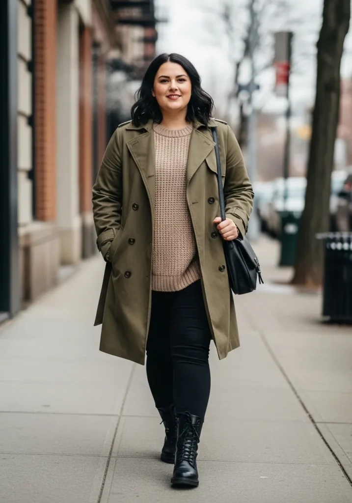 This look blends an olive green trench with a warm chunky knit sweater in a soft beige shade that feels perfect for chilly walks. The trench has that classic double breasted structure that always looks put together while the sweater adds a comfy texture that tones everything down in the best way. Black leggings keep the silhouette sleek and easy while lace up black boots add just the right amount of edge. A simple black crossbody bag finishes the look with a clean and practical touch. The whole vibe is relaxed city chic with a timeless twist.