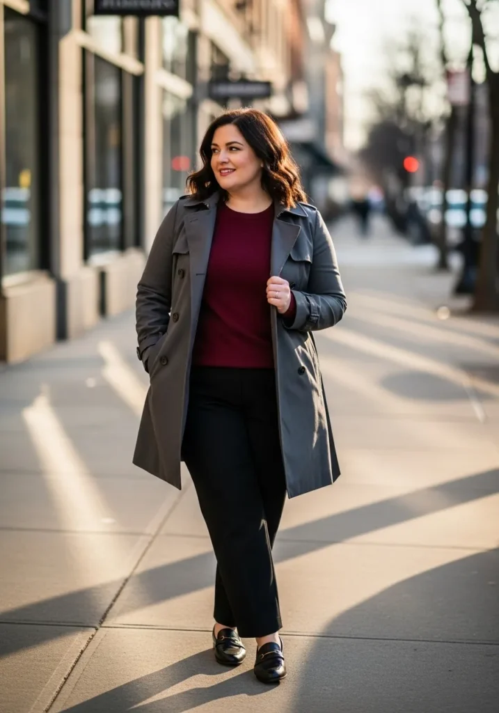 This look brings together a sleek gray trench coat with a rich wine colored knit sweater that feels warm and polished at the same time. The straight leg black trousers add a clean line that keeps everything looking put together while the black loafers give it that easy city ready vibe. The overall feel is simple and elegant with soft textures that balance the structured shape of the trench.
