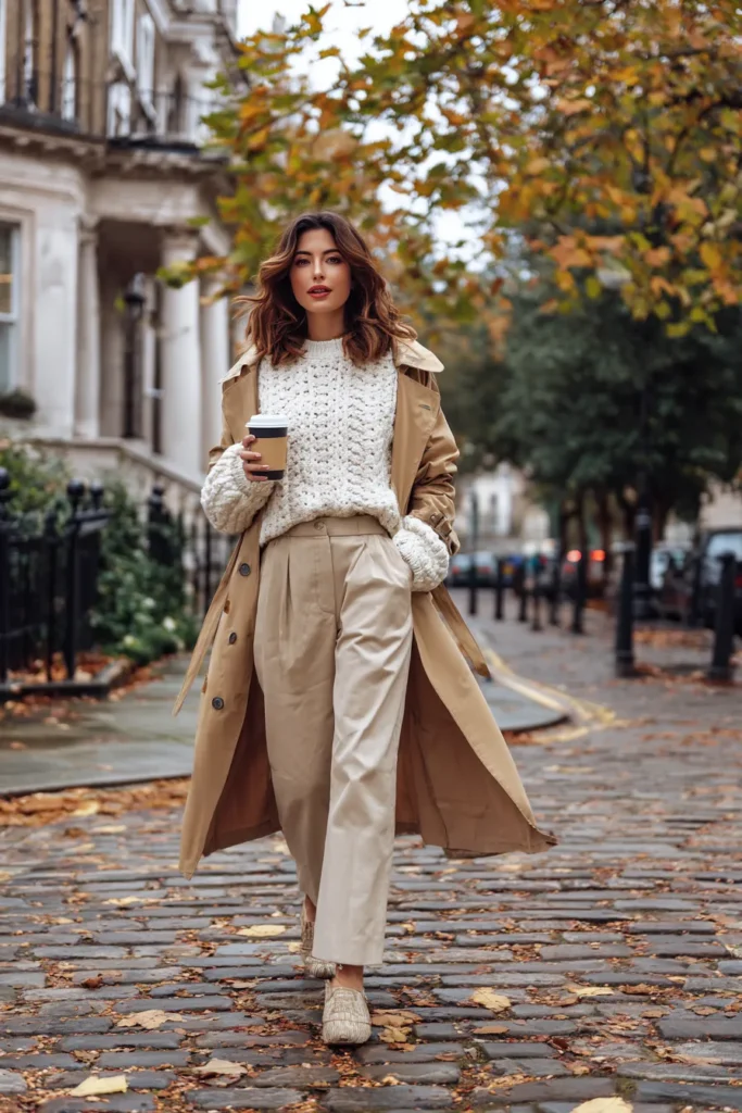 This outfit is such a timeless winter favorite. A chunky cream knit sweater pairs perfectly with high-waisted tailored trousers in a soft beige tone, creating a cozy yet refined base. Layered over it is a long camel trench coat that sways naturally with each step, adding that classic polished vibe. Neutral loafers keep the look comfortable for walking, while the warm coffee cup in hand completes the candid city-girl aesthetic. The cobblestone street and autumn leaves in the background give the whole scene an extra dose of charm.