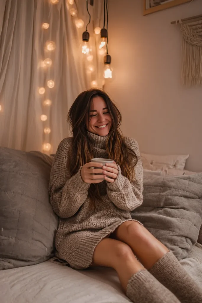This outfit is the ultimate stay-at-home winter vibe. A chunky taupe knit sweater dress drapes softly for that relaxed, comfy fit while still looking super cute. Paired with matching knit socks that go just below the knees, it creates a warm and cozy look that feels perfect for lounging. The soft lighting and string lights in the background make the whole scene feel extra magical, like the perfect winter evening curled up with a hot drink.
