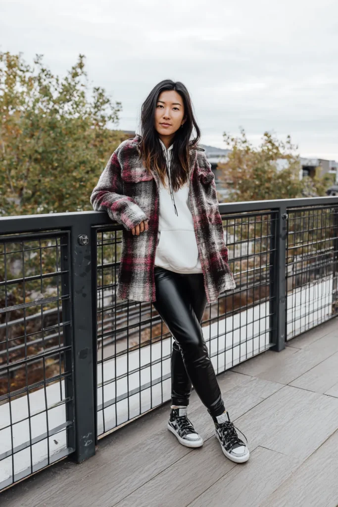 This outfit is such a cool take on casual winter style. A soft oversized plaid shacket in burgundy and cream tones adds instant warmth and texture, layered over a crisp white hoodie for that cozy laid-back feel. Black faux leather leggings bring a sleek and edgy contrast, while high-top sneakers keep the whole look grounded and playful. The mix of textures makes the outfit interesting without trying too hard, perfect for casual outings.