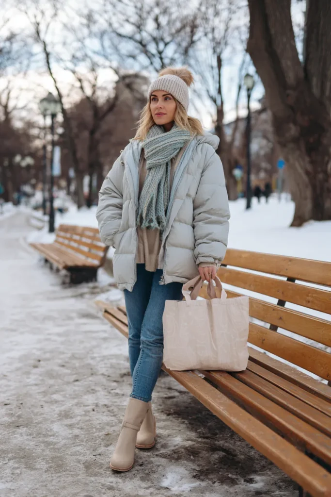 This look is all about warmth with style. The oversized light gray puffer coat makes the perfect outer layer for chilly days, while the cozy knit scarf and matching beanie with a playful pom-pom add an extra layer of charm. Slim-fit blue jeans keep the outfit casual and balanced, and the beige ankle boots tie the whole palette together beautifully. A large cream tote bag adds a practical yet chic finishing touch, perfect for strolling through snowy city parks or running errands in the cold.