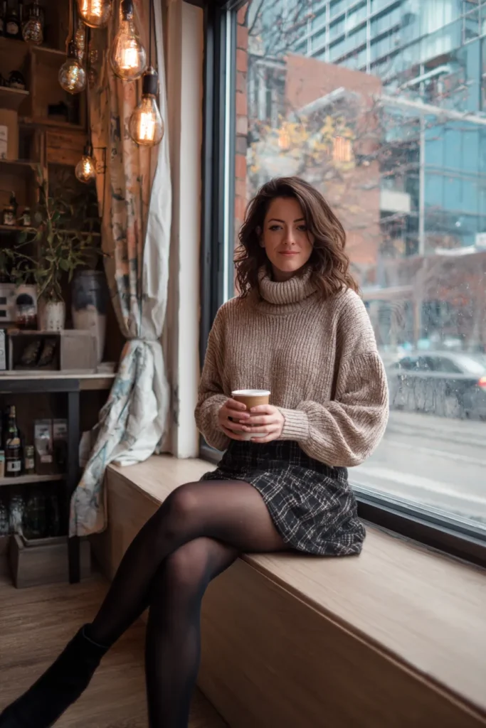 This outfit mixes cozy and chic in the best possible way. The chunky taupe turtleneck sweater has that relaxed oversized fit with balloon sleeves that feel extra snuggly, while the plaid mini skirt keeps the look playful and a little bit preppy. Black tights and ankle boots balance out the proportions and add just enough polish, making it perfect for both casual coffee shop days and little outings around the city. The soft indoor lighting and window seat give the whole look an effortlessly stylish vibe.