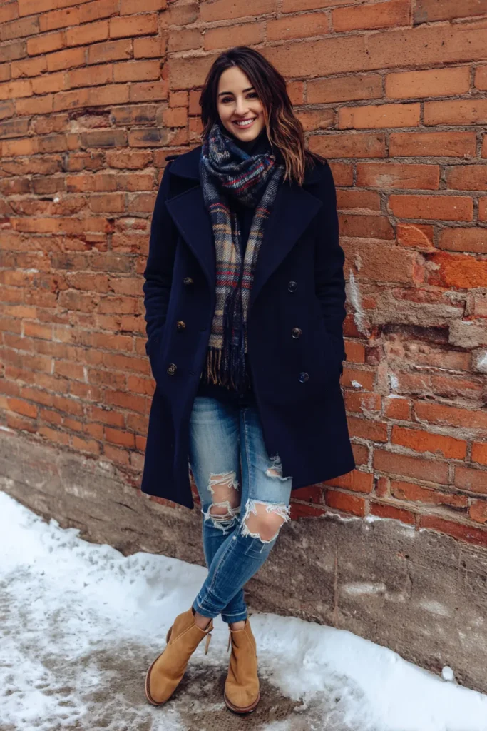 This outfit is a winter classic with a playful edge. A tailored navy double-breasted coat creates a polished silhouette, while the oversized plaid scarf adds both warmth and a pop of texture. The ripped skinny jeans give the look a casual, laid-back vibe, perfectly contrasted by the structured coat. Finishing it off, tan ankle boots keep things grounded and cozy, making this a go-to outfit for cold days that still call for a bit of style.
