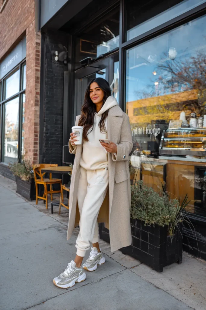 This outfit proves that comfort can still look chic. A soft cream hoodie and matching joggers set the foundation for a laid-back vibe, while the long beige wool coat instantly elevates the look with a touch of polish. Chunky white sneakers keep it modern and practical for city strolls, and the warm coffee cup in hand makes it even cozier. The neutral palette feels clean and sophisticated, perfect for a casual winter day out.