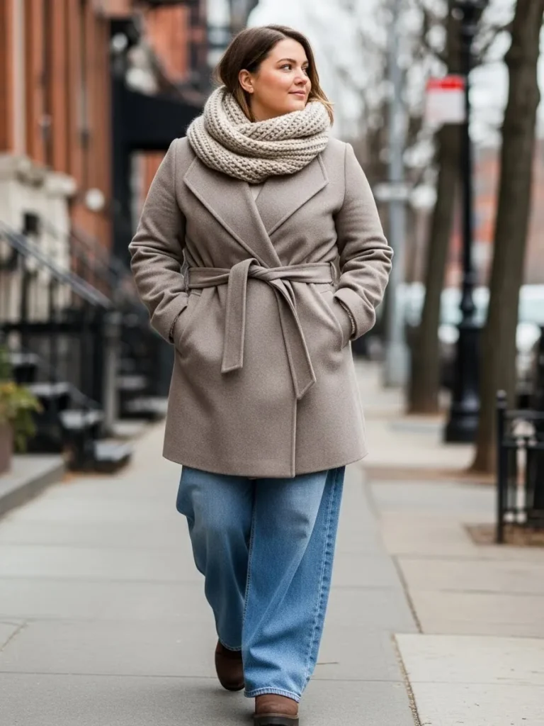 This look brings together a chic taupe wrap coat with a cozy belt that pulls the waist in just right, paired with a thick oatmeal knit scarf that looks like the fashion equivalent of a warm hug. The soft neutral tones feel calm and effortless, while the relaxed wide leg jeans add a laid back vibe that feels perfect for everyday winter strolls. The outfit finishes with simple brown boots that keep everything grounded and classic. The whole look feels warm, polished and incredibly wearable without trying too hard.