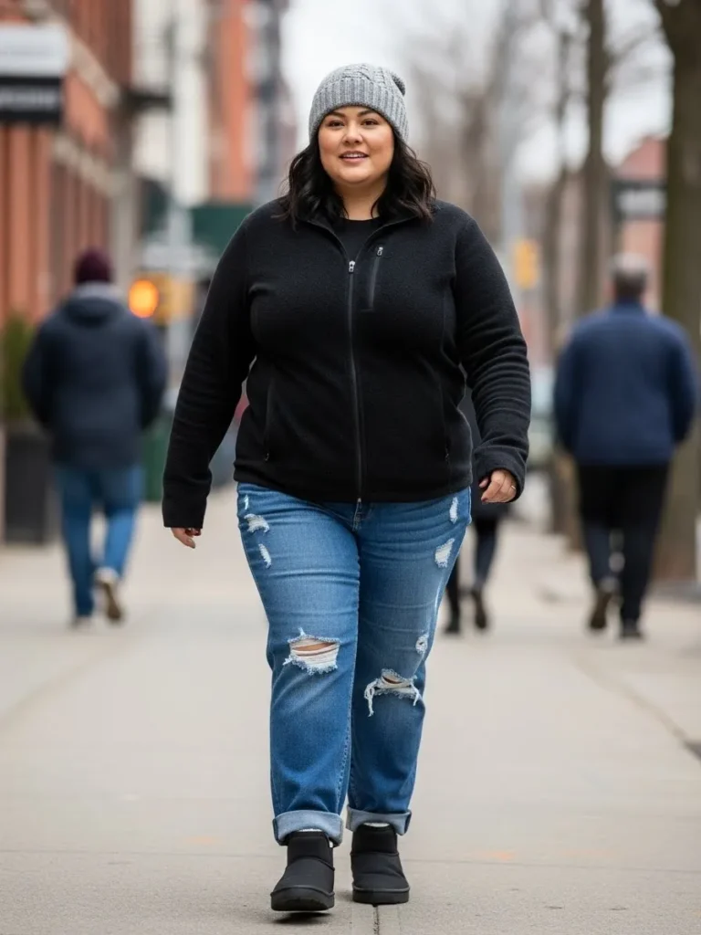 This look brings together all the easygoing winter essentials that make cold weather feel a bit more fun. The outfit features a soft black zip up fleece that adds warmth without feeling bulky paired with lightly distressed blue jeans that keep the vibe relaxed and wearable. The cuffed hems add a cute little touch and the black winter boots tie everything together with a clean simple finish. The outfit gets an extra cozy moment with a grey knitted beanie that looks soft enough to live in. The whole look feels laid back comfortable and perfect for a casual day out.