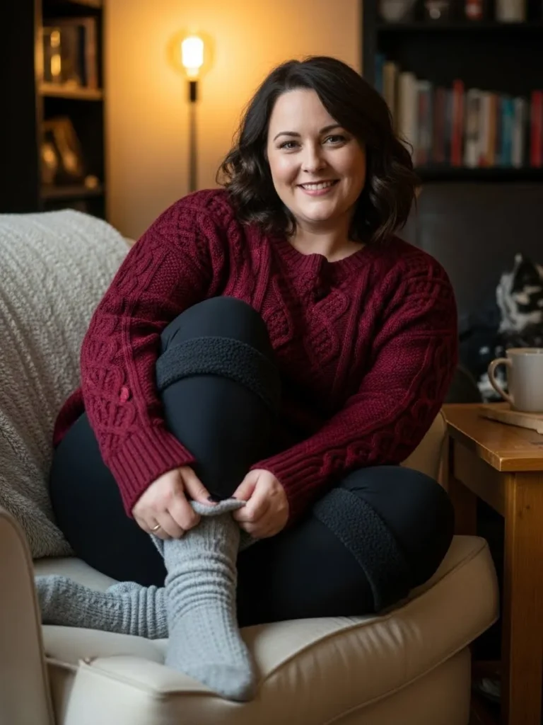 This outfit is all about settling into winter comfort with style. The deep burgundy cable knit sweater brings that warm, homey vibe with its chunky texture and relaxed fit. Paired with soft black leggings and matching knit leg warmers, the whole look feels intentionally snuggly. The grey ribbed socks add a cute contrasting touch that still keeps everything soft and neutral. The overall feel is warm lighting, soft fabrics, and the kind of cozy moment that makes you want to curl up with a book.