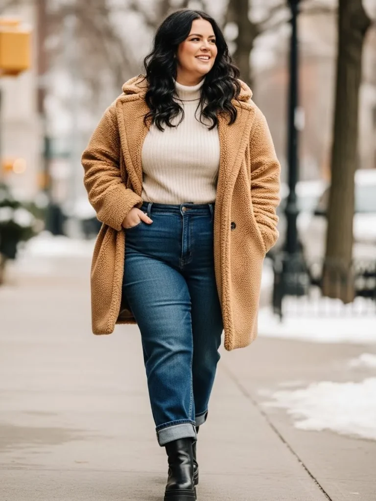 I love how this outfit works because the teddy coat instantly adds volume in a way that feels intentional and cozy rather than overwhelming. The fitted turtleneck creates balance and highlights the waist without feeling tight. The jeans give a timeless shape that flatters curves so naturally. And honestly the black boots are the little confidence boost at the bottom that make me feel grounded and ready to conquer my cold weather to do list. It is warm comfortable and still feels cute enough for a latte run or a casual day out.