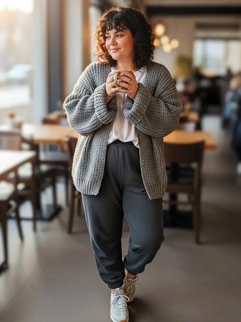 This look is all about easy warmth with a touch of effortless charm. The chunky grey knit cardigan instantly sets a cozy mood and pairs so well with the relaxed white tee underneath. The dark grey joggers keep everything feeling soft and snuggly while giving that modern athleisure vibe. Paired with comfy sneakers and warm café lighting, the whole outfit feels like the perfect blend of relaxed style and everyday winter comfort.