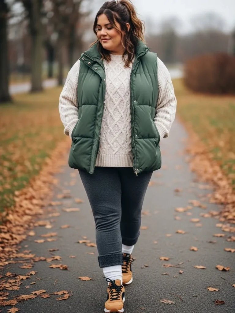This outfit brings together all the best winter textures in the prettiest casual way. The soft cream cable knit sweater sets the tone with its warm and chunky feel, while the forest green puffer vest adds that extra layer you want on chilly park strolls. The charcoal leggings keep everything sleek and comfy, and the cozy socks peeking out above the tan lace-up sneakers give the whole look an effortless, everyday charm. It feels like the kind of outfit you throw on when you want to be warm, cute, and completely at ease.