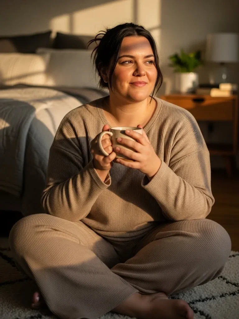 This outfit is the definition of soft winter comfort. The matching ribbed knit top and pants in a warm beige tone create the kind of cozy look that makes you want to curl up with a mug of something warm and stay there all morning. The fabric looks plush and stretchy with that gentle hug-your-body feel that makes loungewear irresistible. The relaxed fit, full sleeves, and wide leg pants bring a calm and effortless vibe, and the natural sunlight in the scene makes the whole look feel even warmer and more inviting.