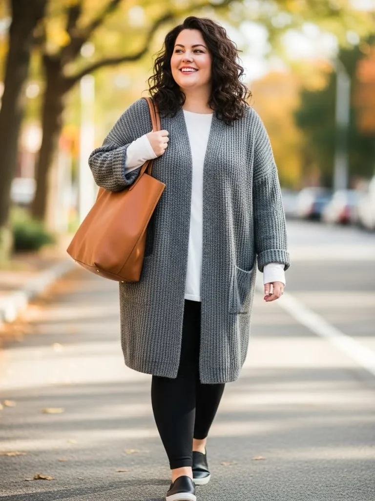 I love how this look feels calm and put together at the same time. The long cardigan creates such a gentle vertical line that always makes me feel a little taller and a lot cozier. The leggings balance the volume on top and the brown tote adds personality without trying too hard. It is the kind of outfit I reach for when I want to feel cute but also want to stay wrapped in something soft all day.
