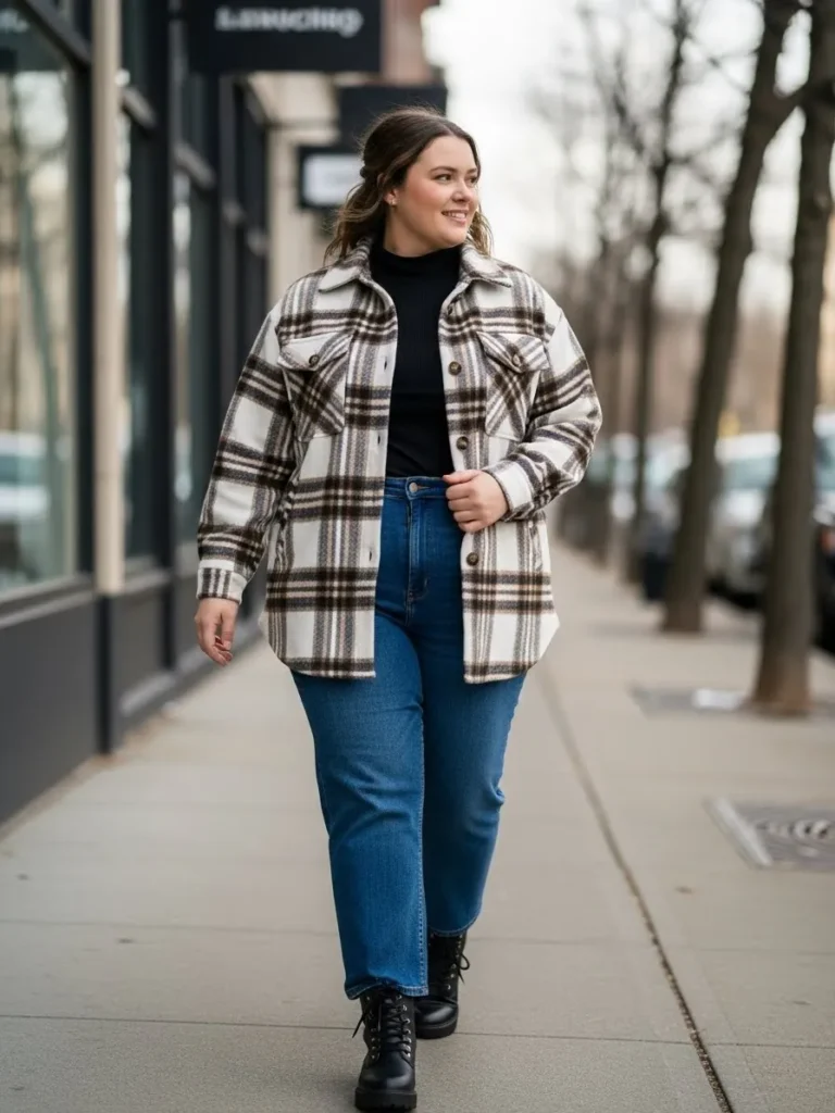 This look pairs a soft oversized plaid shacket in warm brown and cream tones with a simple black mock neck top that keeps everything clean and streamlined. The mid wash straight leg jeans add a relaxed and easygoing feel while the black lace up boots ground the outfit with a little edge. The whole vibe feels cozy and comfortable enough for a casual winter stroll but still put together in a way that looks intentional.