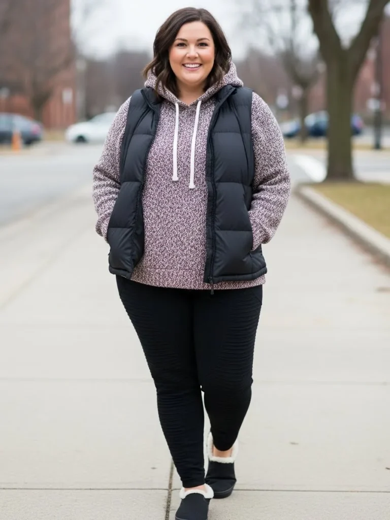 This look is all about easy comfort with a cute winter twist. The outfit pairs a soft speckled mauve hoodie with a cozy fabric that feels perfect for chilly errands. Over it sits a black puffer vest that adds warmth without the bulk, giving the whole look a relaxed layered vibe. The black leggings keep everything sleek and simple while the fuzzy lined slip on shoes add that little touch of comfort we all secretly love on cold days. The overall feel is casual and warm with a hint of sporty weekend energy.