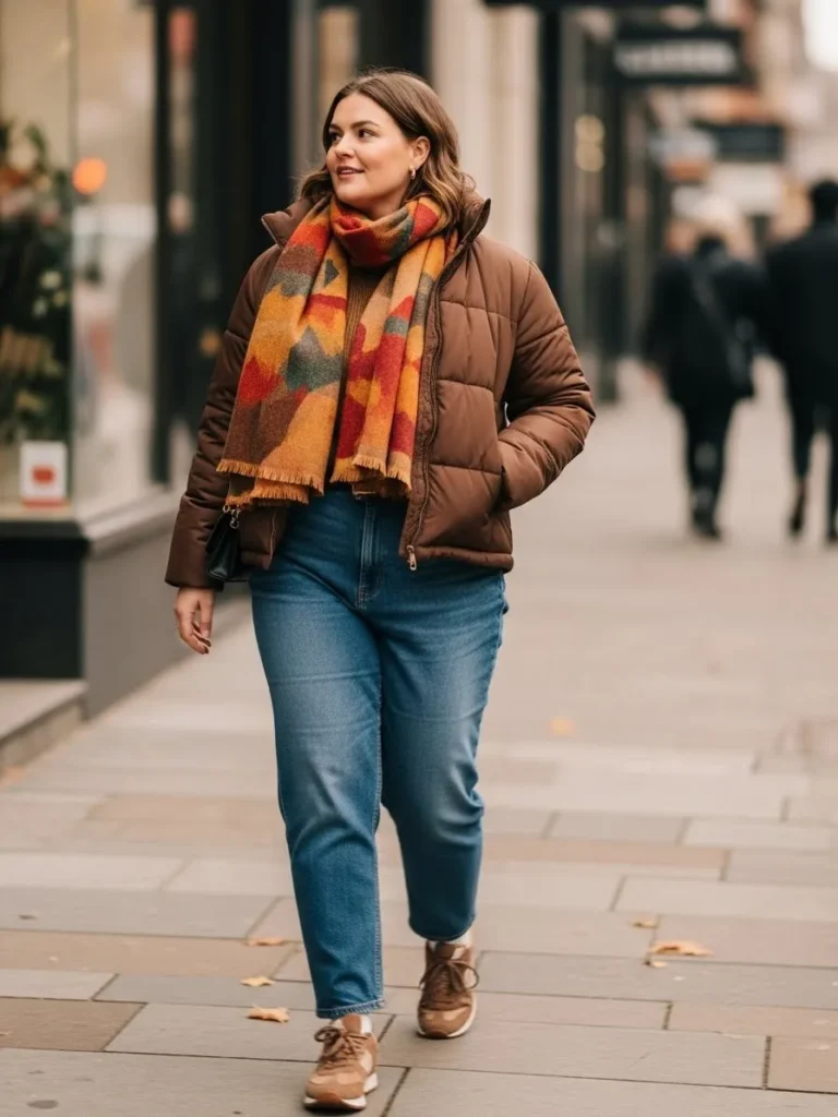 This outfit brings together everything I love about cozy winter style. The warm brown puffer jacket feels soft and snug, perfect for chilly mornings. The bright patterned scarf adds a playful pop of color with those warm oranges and reds that instantly lift the whole look. Paired with classic blue jeans and comfy tan sneakers, the outfit feels relaxed and effortless. The whole vibe is casual city stroll meets cute winter confidence.