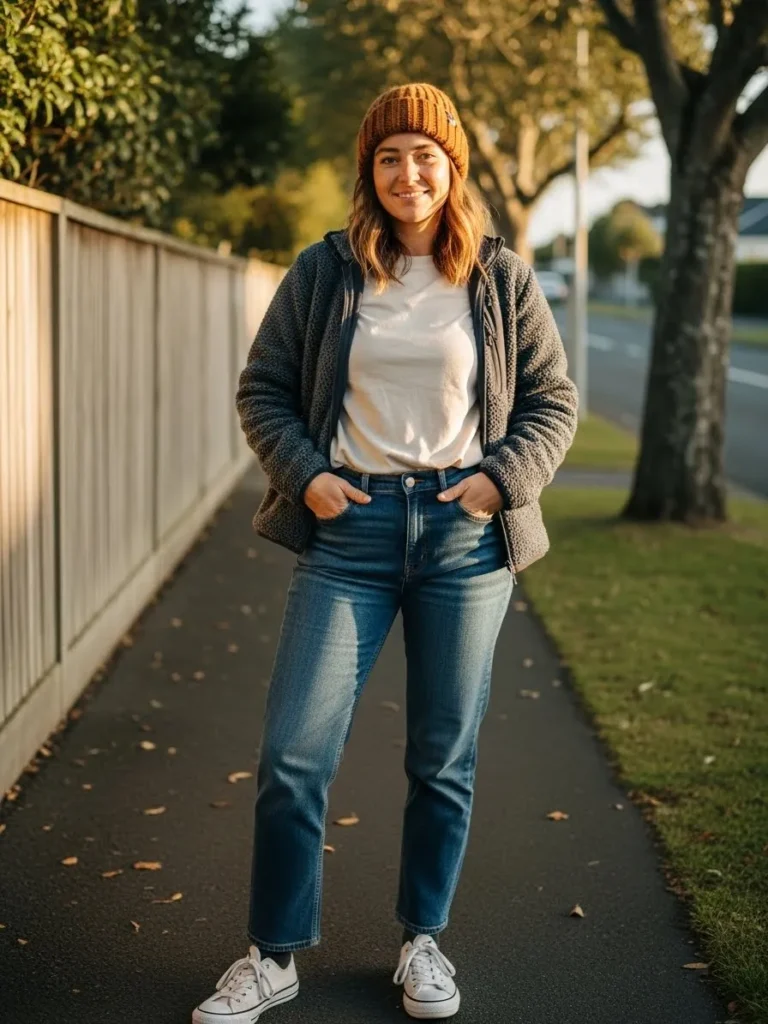 Here we have a relaxed pair of straight leg jeans styled with a basic white tee and a textured zip jacket. A knit beanie adds warmth and a laid back vibe. White sneakers keep things practical and comfortable. It feels like a true everyday outfit made for real life.