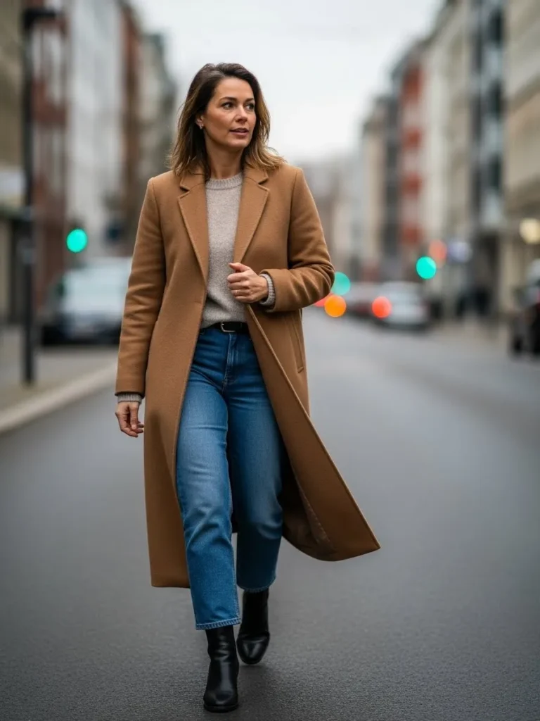 Here we see classic blue jeans styled with a neutral knit sweater and a long camel coat. Black ankle boots give the outfit a slightly more polished feel. The color palette stays soft and timeless.
