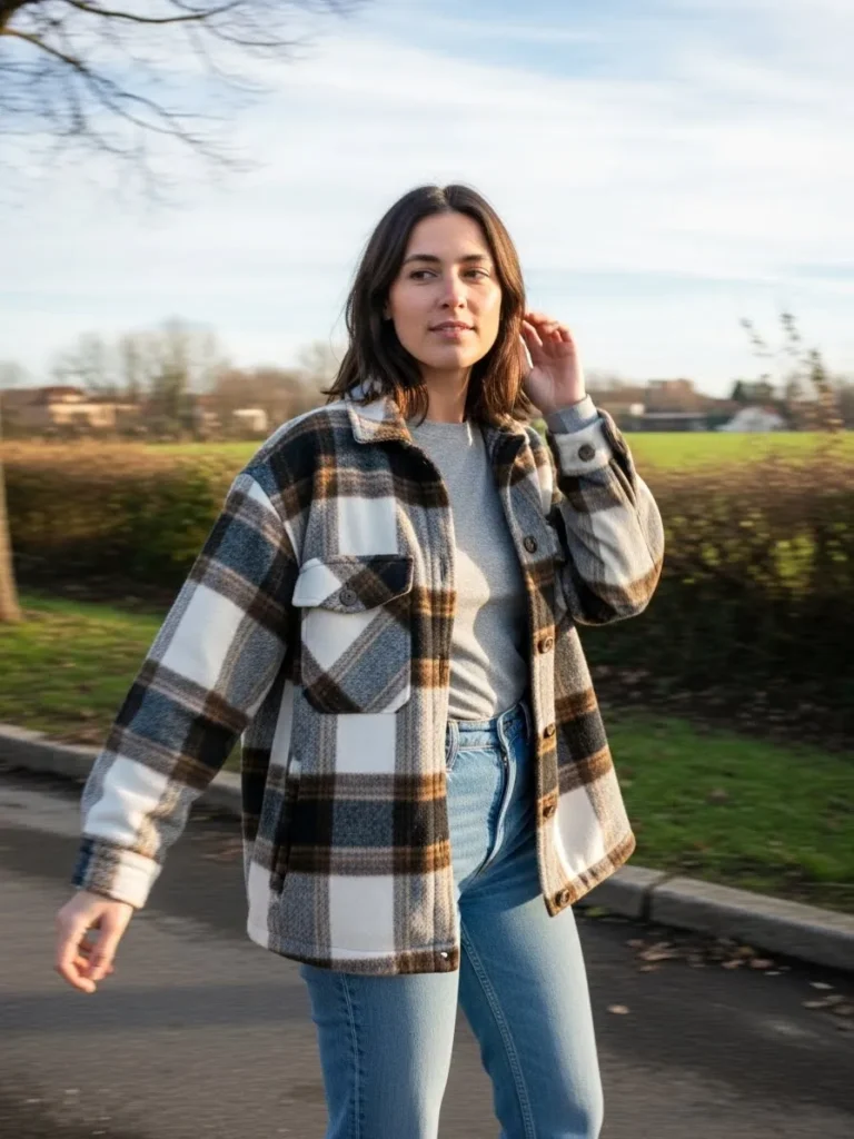 This outfit features blue jeans paired with a simple gray top and an oversized plaid shirt jacket. The earthy tones feel cozy and grounded. The fit stays relaxed and easy.
