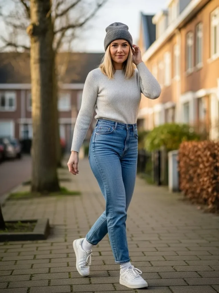 This look pairs high waisted blue jeans with a fitted ribbed knit sweater and a cozy beanie. White sneakers keep the outfit casual and practical. Everything feels clean and easy.