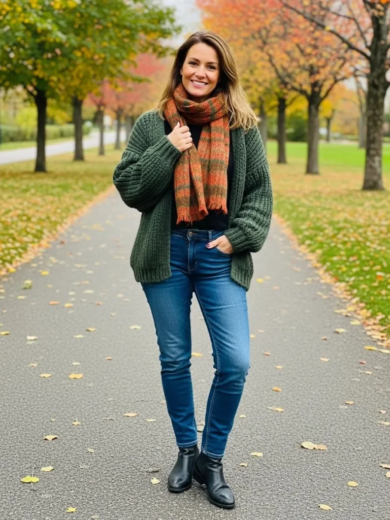 Here we see slim blue jeans styled with a chunky green cardigan layered over a dark top. A warm plaid scarf brings in fall colors and texture. Black ankle boots ground the look and keep it practical.